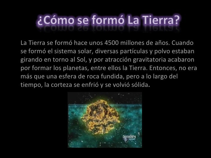 La Tierra era entonces polvo cósmico y gases que, por acción de la gravedad, se transformaron en una masa de material fundido e incandescente . Este material empezó a reorganizarse hace 4500 millones de años en capas, de forma que en el interior estaban los materiales más densos y en el exterior los más ligeros, como el vapor de agua y otros gases. Al enfriarse, los materiales de la superficie se solidificaron para formar la litosfera oceánica y los gases se desprendieron dando lugar a la atmósfera primitiva. (Ref. http://www.hiru.eus/geologia/la-historia-de-la-tierra)